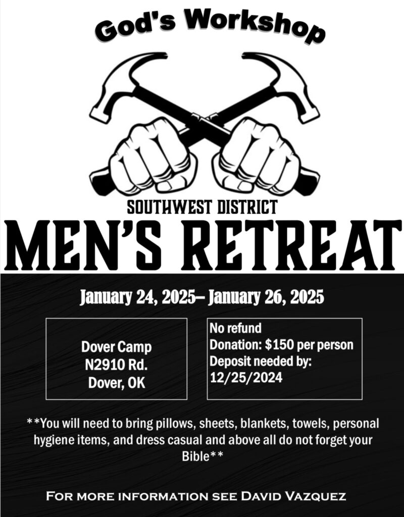 Men’s Ministry Director: Sergio Alfaro Contact E-mail: sergioalfaro@hotmail.com SWD MEN’S RETREAT January 24-26, 2025 Dover CampN2910 Rd. Dover, OK