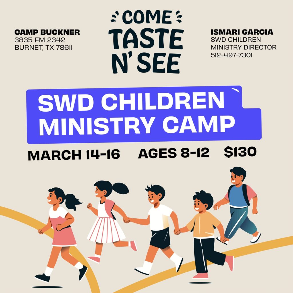 Ministry Director: Ismari Garcia Contact e-mail: ismarig@yahoo.com UPCOMING EVENTS March 14-16, 2025 Ages 8-12 Contact us for more information Ismari Garcia: 512-497-7301 Camp will be held @ Camp Buckner3835 FM 2342 Burnett, TX 78611